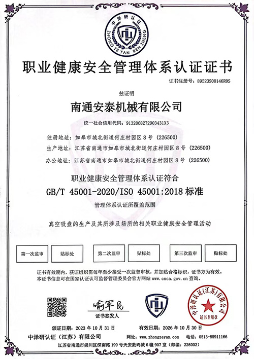 职业健康安全管理体系认证证书