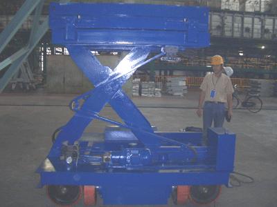 该设备应用于攀钢1250热镀锌生产线连退火炉底盖的维修更换。设备载重量3000公斤,可在负载状态下纵横两个方向电动行走,起升高度2209,工作台可前后左右电动液压微调150mm。